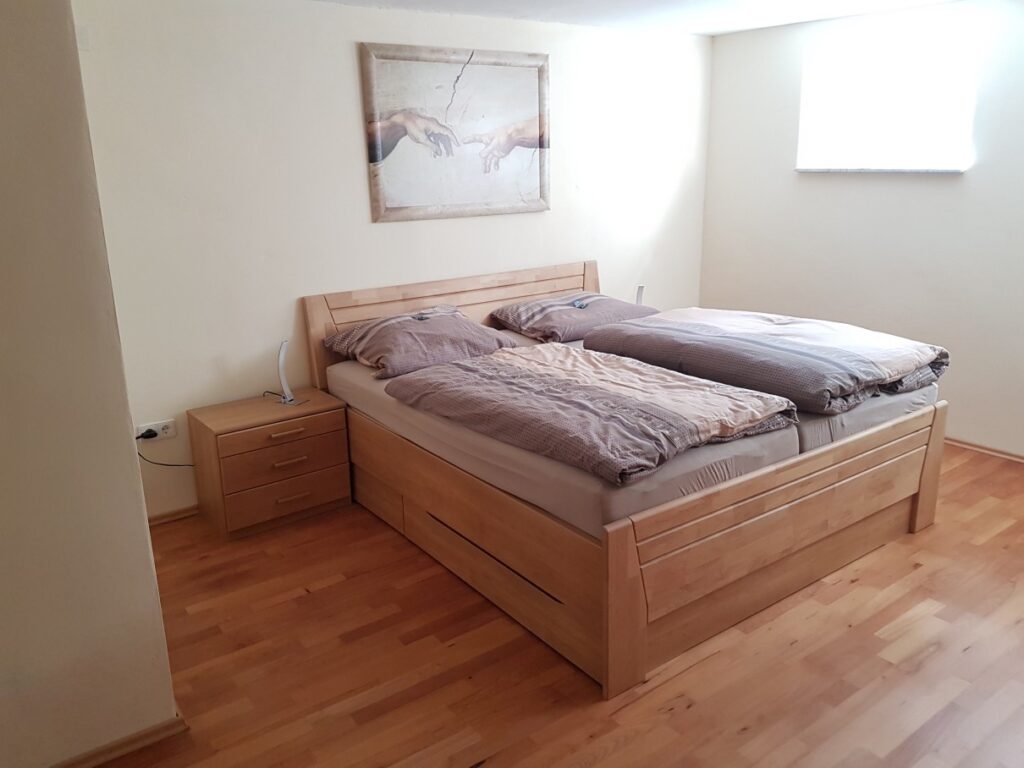 Seit 2019 vermiete ich zusätzlich ein Doppelzimmer im Kellergeschoss mit Bad und separatem Eingang. Ausgestattet ist das Doppelzimmer mit Fernseher, Wasserkocher, 2 Gläsern und 2 Tassen. Eine kleine Auswahl an Tee’s und Kaffee stelle ich auch zur Verfügung.